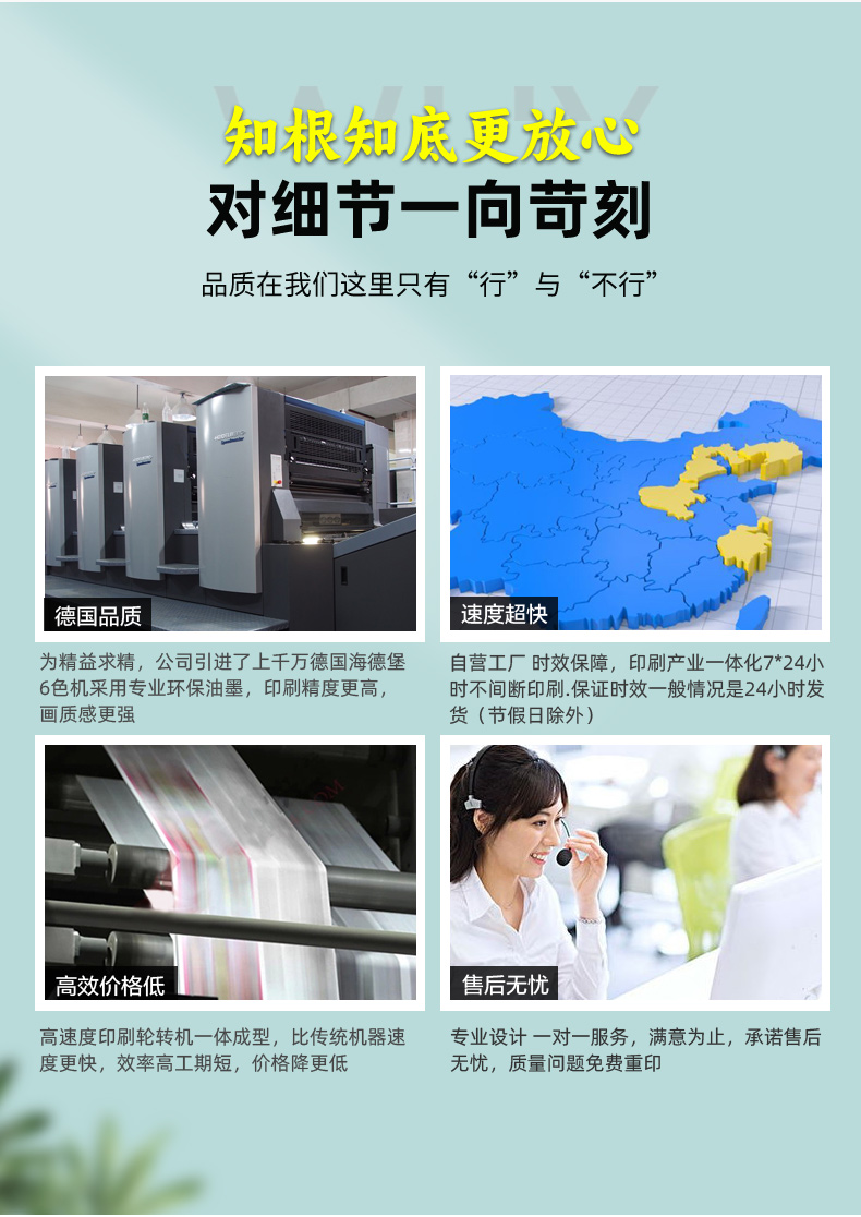 公司本着”自成一格、忠于初心、以人为本、共求发展"为经营理念;以印刷设备齐全,高效率、低价格、质量好的优势,为本地区许多知名企业提供了完整的设计、制版、印刷、装订成型、配送于一体的一条龙印刷服务,同时建立了庞大的客户网络,取得了规模效应的同时用我们的成熟的商业模式,专业的团队为广大企业提供了全方面的优质服务。公司主营业务:精品礼盒设计生产/精装盒、书型盒、天地盒、抽屉盒、卡纸盒(茶叶白酒、饮料、医药保健品、化妆品、电子产品、月饼、粽子、盐蛋、土特产、春节礼品服装、鞋袜、内衣、毛巾)等特色定制包装;宣传资料设计印刷/画册 (精装书、酒店菜谱、普通胶装、锁线胶装、!骑马钉)