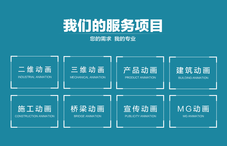 我们的服务项目:二维动画,三维动画,产品动画,建筑动画,施工动画,桥梁动画,宣传动画,MG动画.